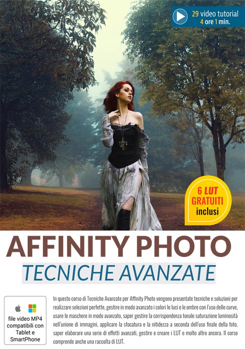 In questo corso di Tecniche Avanzate per Affinity Photo vengono presentate tecniche e soluzioni per realizzare selezioni perfette, gestire in modo avanzato i colori le luci e le ombre con l’uso delle curve, usare le maschere in modo avanzato, saper gestire la corrispondenza tonale saturazione luminosità nell’unione di immagini, applicare la sfocatura e la nitidezza a seconda dell’uso finale della foto, saper elaborare una serie di effetti avanzati, gestire e creare i LUT e molto altro ancora.